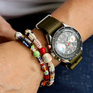 The makers are avid collectors of rare and unusual beads, gathered over years of travel and incorporated thoughtfully into each composition. Bracelet 007 draws its palette from time spent in Osaka’s older neighbourhoods and surrounding Kansai towns, where everyday colour appears in layers — painted shopfronts, ceramics, festival objects, weathered timber, and seasonal produce. Moss green, indigo, brick red, ochre, and soft sky tones sit alongside brighter accents, creating a composition that feels grounded yet lively.